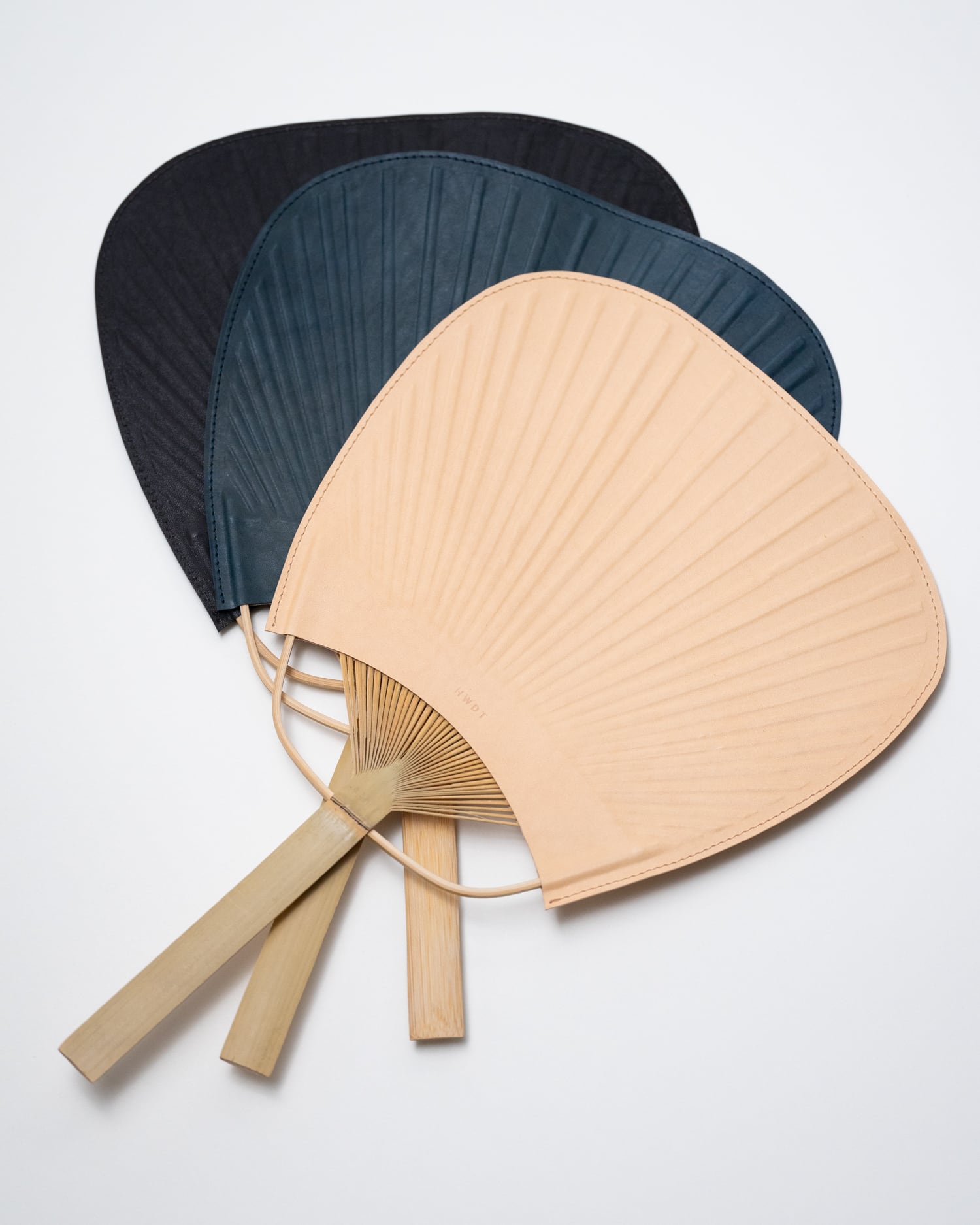 阿波踊りで使われるうちわをモチーフに、徳島で染められた藍染・泥染めの革を使用し制作されています。